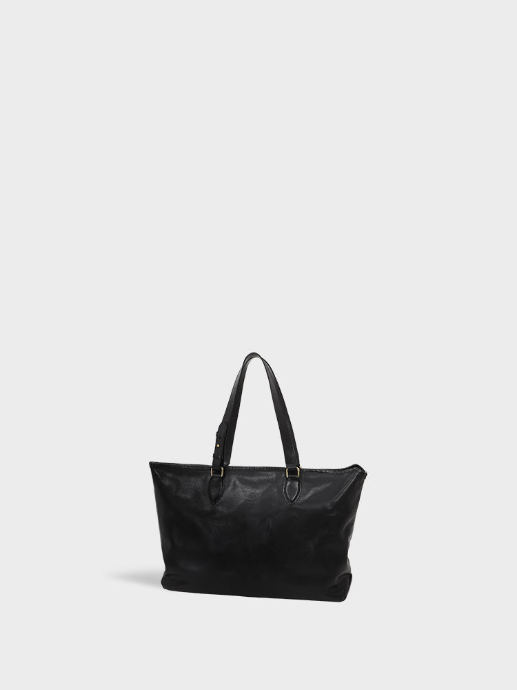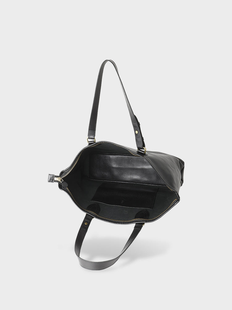 This horizontal tote bag with a large opening and a zipper, made from a single piece of leather, is highly versatile and suitable for both business and casual scenes.